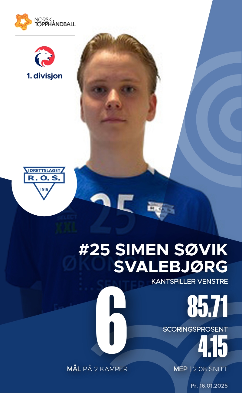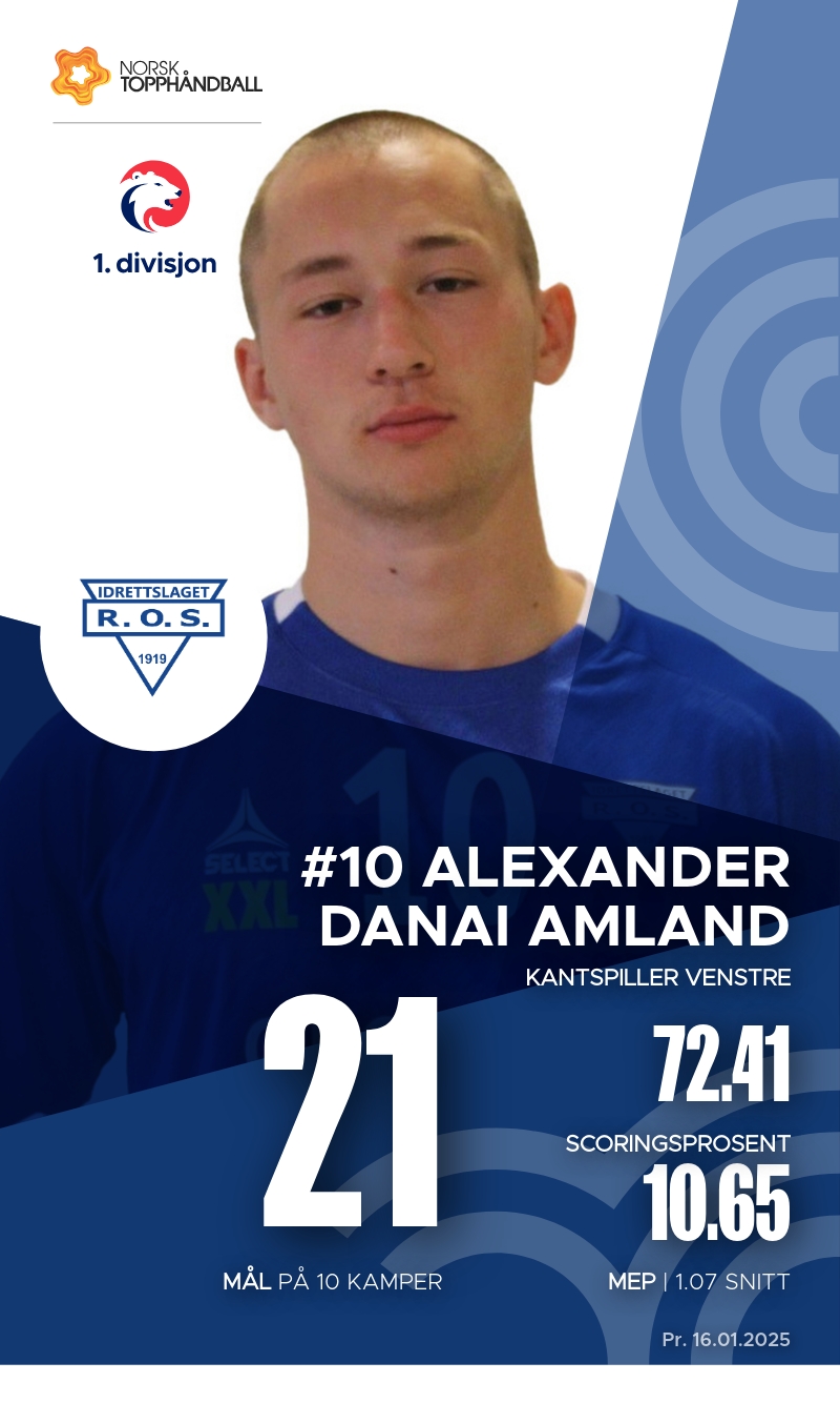 Ros har flere spillere som har utmerket seg denne sesongen. Ola Viskum er en sentral spiller med hele 69 mål på 115 skudd, samt 50 assists, noe som gir ham en effektivitet med en MEP på 3.3. Alexander Danai Amland har også bidratt med 21 mål og 6 assists, mens Theodor Nikolai Kortvedt har vist seg som en solid spiller med 20 mål. Simen Søvik Svalebjørg har vært effektiv med 6 mål på bare 7 skudd, noe som viser at han utnytter sjansene godt. Disse spillerne er viktige bidragsytere til Ros’ suksess i 1. divisjon.